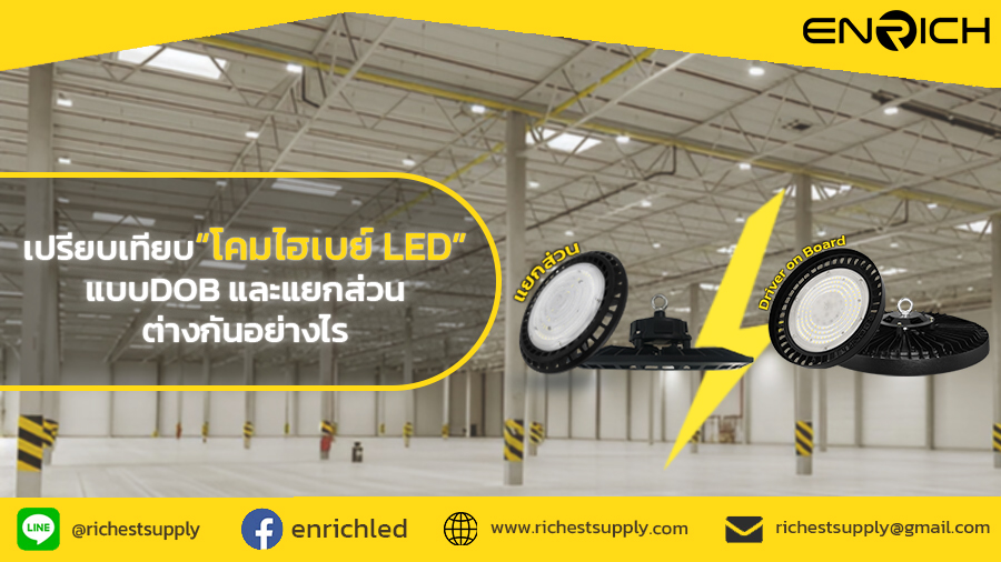 โคมไฮเบย์ LED เป็นโคมที่ถูกเลือกใช้สำหรับในพื้นที่ที่มีเพดานสูงไม่เกิน 14 เมตรเช่น โกดัง โรงงาน หรือสถานที่ที่ต้องการแสงสว่างสูง คุณอาจเคยได้ยินเกี่ยวกับโคมไฮเบย์แบบ DOB (Driver on Board) และ โคมไฮเบย์แบบแยกส่วน สองตัวเลือกนี้มีความแตกต่างกันอย่างไร และแบบไหนเหมาะกับคุณมากที่สุด? วันนี้เราจะมาหาคำตอบกัน!